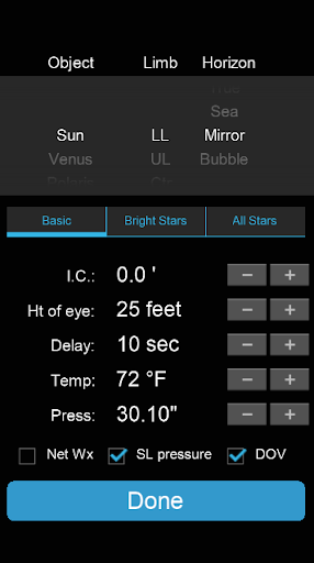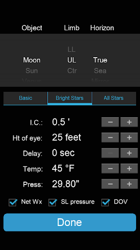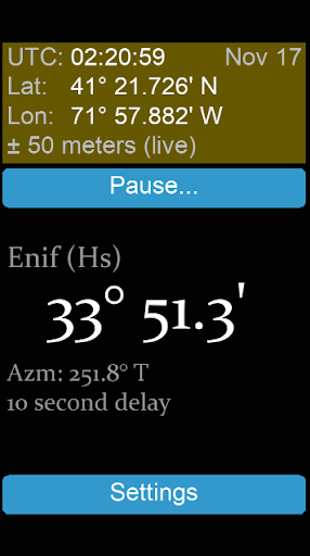 Sextant required! Instant celestial navigation... The most reliable way to detect GPS Spoofing and other anomalies of electronic navigation is by comparing against the measured altitudes of celestial bodies including the Sun, Moon, bright planets and stars. This app calculates the exact altitude that should be observed with a sextant assuming that the GPS position is correct. No paperwork is required, no tables of corrections. All corrections are included automatically: index error, system time error, dip of the horizon, refraction, temperature and pressure corrections to refraction, altitude above sea level, parallax, and also gravitational deflection of the vertical (a correction of up 2 nautical miles not handled by any other celestial navigation sight-clearing product) are all included automatically. It's also a great sextant trainer: take a sight and immediately compare against the app's display. The app works off-network. If a network connection is available, it can download temperature and pressure information automatically. The ephemeris data is generated from the same JPL numerical integrations of lunar and planetary motions used by the official Nautical Almanac and Astronomical Almanac. All coordinates are accurate to one second of arc, and displayed sextant altitudes are accurate to better than a tenth of a minute of arc (the limiting precision of the best marine sextants).