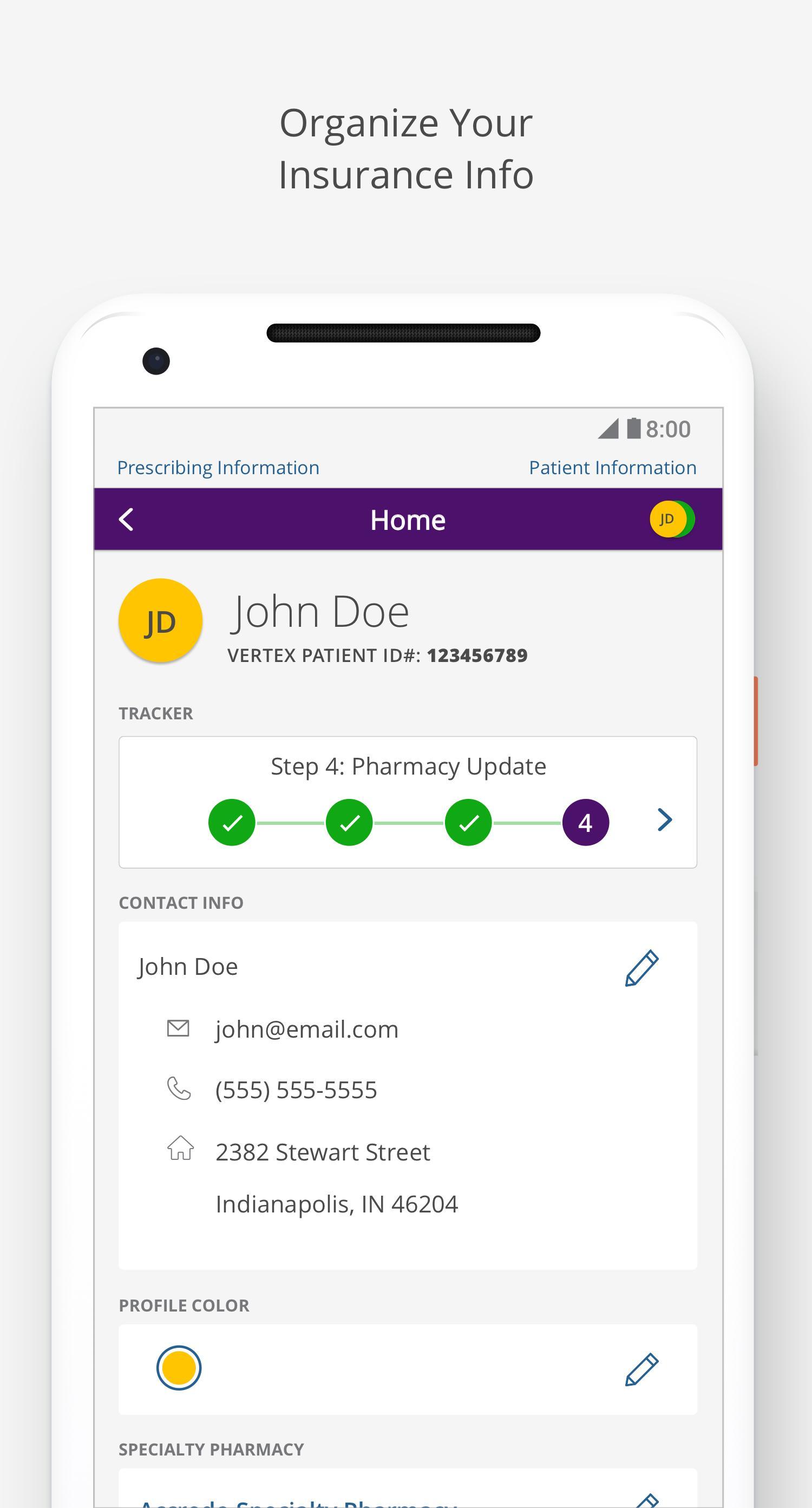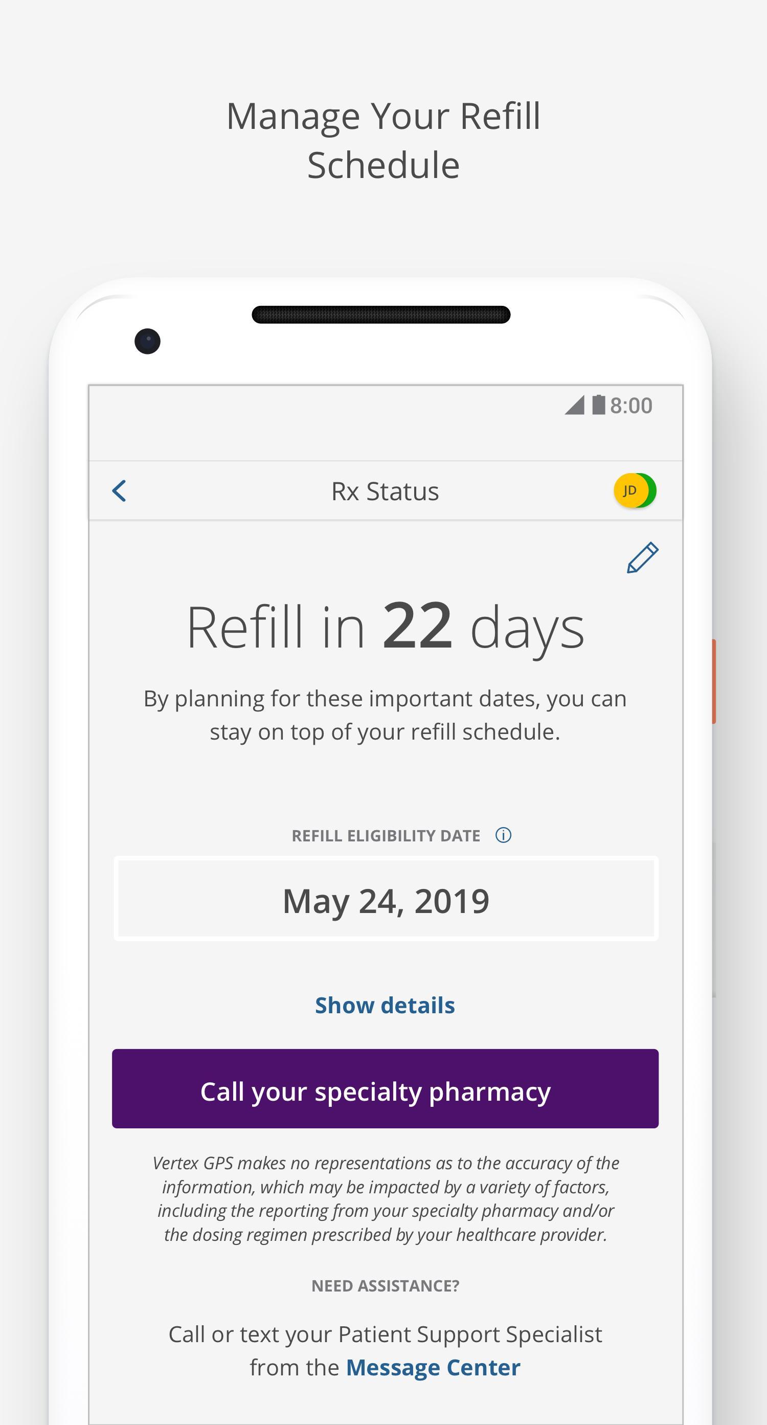 • Customizable refill reminders to help keep track of Vertex medication shipments
