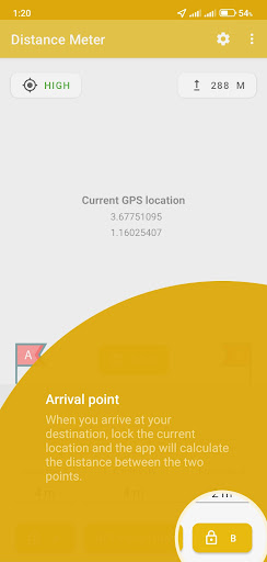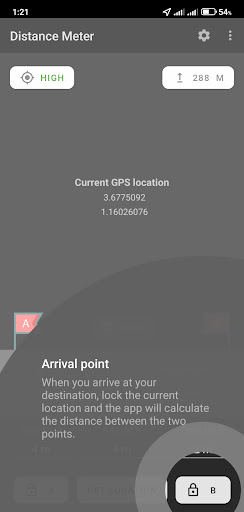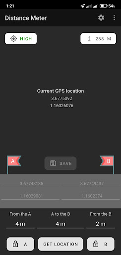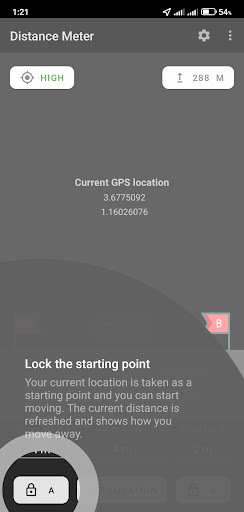 How to use: Go to your start point (A) and press "Lock A", then walk or drive to end point and press "Lock B". In addition to seeing the distance between two locations, you can also see the current distance from one or the other location that is updated as you move. To ensure accuracy, make sure the sky is clear.