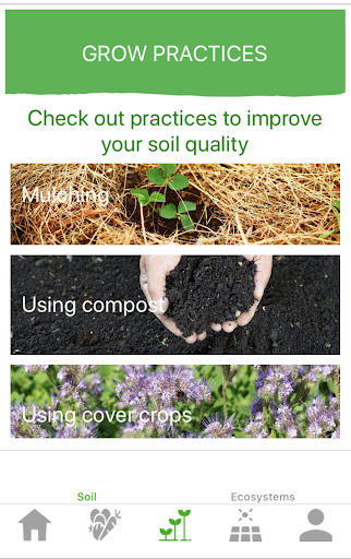 The GROW Practices app module offers science based information on regenerative growing practices that help improve your soil as well as practices that help support the wider ecosystem. Each practice is described in detail and it includes overall benefits of the practice, special considerations you need to be aware of. It also includes examples and hands-on tips if you want to try the practice in your own garden or food growing plot.