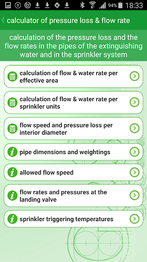 The calculator “flow speed and pressure loss per interior diameter” allows you to calculate the flow speed and the pressure loss in the different pipes on basis of the flow rate. The value for the flow pressure may either manually enter or accept directly from the calculators “calculation of flow & water rate per effective area or “calculation of flow & water rate per sprinkler units”.
