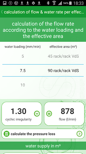 -The calculator “calculation of flow & water rate per effective area” allows you to calculate the flow rate on basis of the water application, the attendant effective area (depending on the risk) and the supposed cychic irregularity. With the next step you may calculate the used water supply via the operating time.