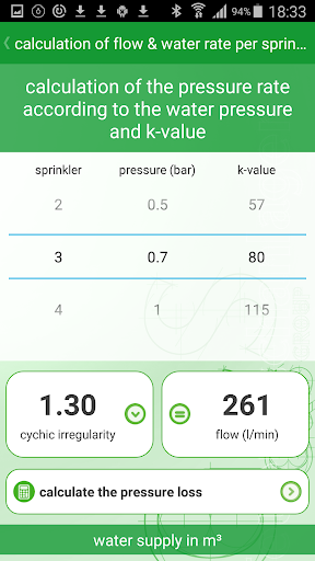 -The button “calculation of flow& water rate per sprinkler units” allows you to calculate the flow rate on basis of the preset number of sprinklers, the used minimum water pressure at the sprinkler, the k-value and the supposed cychic irregularity. With the next step you may calculate the used water supply via the operating time.
