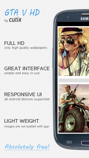 A collection of high quality images of Grand Theft Auto V.More than 20 stunning high-resolution images to your desktop android devices thatapplication makes it unnecessary actions to choose and install on your phone.Features:- Only HD- Only the best, bright imagesOriginal, high quality, convenient!GTA 5 - includes three different stories about very different from each other main characters, among which you can switch at any moment.Mir GTA 5 is going to be huge and diverse (mountains, hills, forests, beaches, etc.). Will be even more freedom. You will be able to fly on airplanes, parachute, diving and many other sports In a series of GTA finally have full NPC zhivotnyh.Grand Theft Auto V (GTA V) - a series of multi-platform video game Grand Theft Auto, the fifteenth in the genre of Action and open world, is being developed by Rockstar North. The debut trailer was released on November 2, 2011, and the announcement of the game took place on the following day, November 3. The game is scheduled for spring 2013 for Xbox 360 and PlayStation 3.2012 2013 2014 2015Mestom action Grand Theft Auto V was the fictional city of Los Santos (born Los Santos), apparently copied from the Los Angeles area. Los Santos first appeared in one of the previous games - Grand Theft Auto: San Andreas, which was published in 2004. In the game apart from the city, will also attend the surrounding area countryside, mountains, forests, hills, and beaches. The other major cities in the state of San Andreas, according to Rockstar Games, will not be. In the January issue of Game Informer for the year 2012 published an interview with Dan Houser, where he said that the size of the map in GTA V will be very bolshim.V interview to IGN in March 2012, Dan Houser told about some features multiplayer Max Payne 3 . In an interview he said that, as in Max Payne 3, GTA V will be available to the system of "gangs" (english crews) - analog of ordinary clans, which means players will be able to organize online service Rockstar Games social Club (English) He also said that the importance of multiplayer in the past few years has increased many times, so Rockstar Games intends to actively develop online aspects of their games.