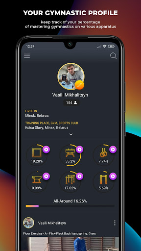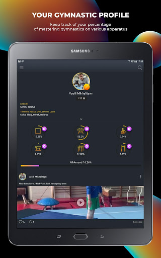 Watch the diagrams in your profile that show the percentage of mastering elements on gymnastics apparatuses. The more you upload a video, the greater your percentage becomes. You can find out your percentage not only on each apparatus but also in general in gymnastics.