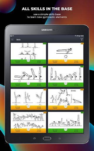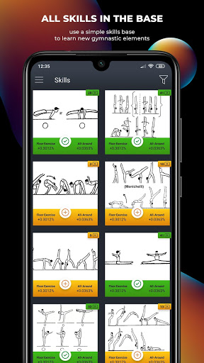 Each element is represented by a picture and description that explain its implementation. You can add your own video for each element and get a percentage of skill on this apparatus.