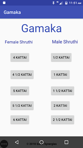 Gamaka detects and draws the swaras (notes) and swarasthanas (tones) in Carnatic music as the singing/playing happens on a real-time basis.The screen on the left side, displays two octaves with twelve swarasthanas for male and female shruthis normally used. Female shruthis: 4, 4 1/2, 5, 5 1/2 and 6 kattais. Male shruthis: 1/2, 1, 1 1/2, 2, and 2 1/2 kattais. Optimum performance: Android 6.0 and above.