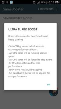 in this app boosts the device for benchmarks & heavy gaming. It sets CPU governor & ensures all cores running at max speed. RAM-Free Tweak & SD Card Boost Tweak is also applied for maximum speed. It speed up the device 30% or even more.