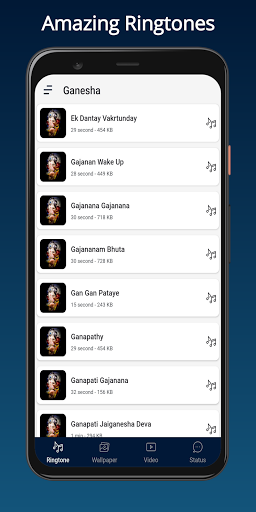 The application Lord Ganesha(Ganpati) Ringtones contains Lord ganesha shlok, Ganpati stuti, Ganesha mantra, Ganesha aarti ringtones, Ganesha video status, Lord Ganesha full hd wallpaper.