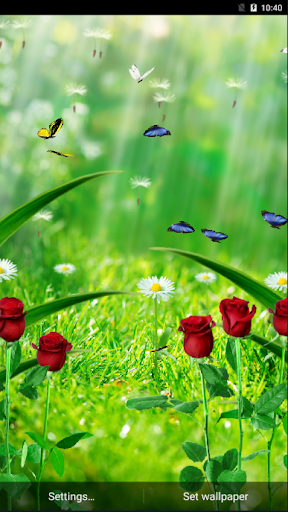 Garden Live Wallpaper is a vivid picture of garden wallpaper with many grass, rose, dandelion, same motion of the wind on screen and some butterflies flying across.