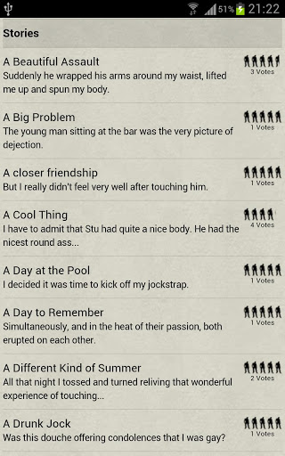 Erotic stories for gay men!Gay short stories that will excite and stimulate you! download this App only if you like hot gay stories with man to man sex.Gay Stories features:- Many gay erotic stories for men- Sexy stories from soft to hard- New gay stories are added at irregular intervals.- All the gay stories are free!- New hot stories are added regularly!If you like erotic sex stories with men, here you will find plenty of hot gay stories. Some bisexual stories are here too! The Bi-stories are marked by an asterisk "*".