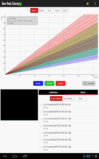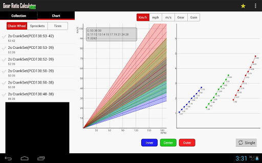 By switch ON/OFF the display of each inner / center / outer gear, you can simulate the optimal gear ratio.