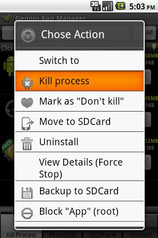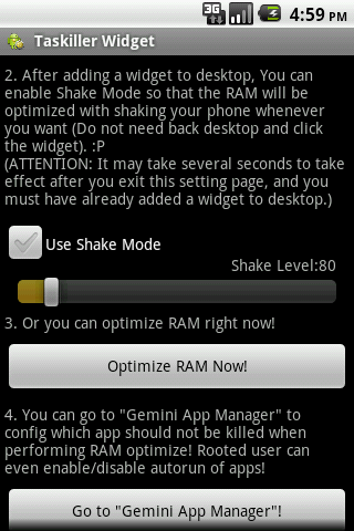 Best TaskillerIf you meet any problem or find any bug, please send mail to quot;support@seasmind.comquot;. We do want to solve the issue, but in many cases, we can not fix issue with just simple comment in market. ThanksThis is a widget used to optimize RAM of your Android device nothing for else :, but it is simple, fast, extreme less RAM usage. The quot;Shake Modequot; allow user to release RAM at any time even when you are playing game by shaking your phone It can be used as either plugin of quot;Gemini App manager v1.5.0 andabovequot; or a independent widget. Features:1. One key press on desktop widget to optimize RAM;2. quot;Shake Modequot; allow user to release RAM at any time even when you are playing game by shaking your phone3. Extreme less RAM usage;4. User can mark quot;Do not killquot; apps in quot;Gemini App Managerquot; and they will be ignored when perform optimize operation.Recent Changes:v1.2.01. Fix the issue that the bluetooth ear phone can not work properly after RAM optimize operation Feedback by Cory Leimkuehler, Bill Kwong, Rafay Aslam, Rodney Steiner, Michael, Dennis;2. Try to fix a UI issue when performing RAM optimize on ASUS panel Thanks to quot;LeRon Childsquot;, from support mail;3. Increase range of shake detected mode to fit more phone modules Feedback by atjiles;4. Use ZipAlign to improve performance and reduce memory usage of the app;5. Other minor issues change support mail to seasmind@gmail com;