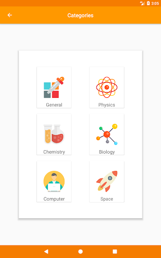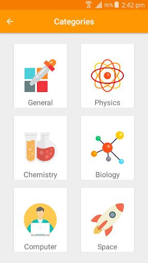 The science quiz app contains categories that include: