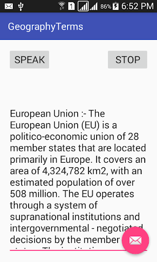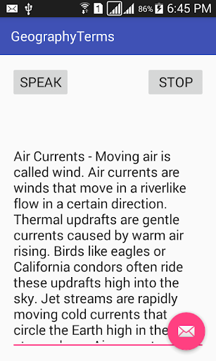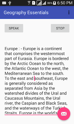 This Software is a tool to make Geography understood in a lucid style. It deals with almost all avenues of Geographical Concepts. It offers reliable ample data on Continents, Countries, Cities, Rivers, Oceans, Deserts, Mountains, Climate, Earth, Crop, Oil, Minerals, Beverages etc. It offers Listening and reading to maximize the learning in easiest way. Software is meant for all from 8th to PhD. This App consists of most of the essentials of Geography which are basics and necessarily needed to a geographer.