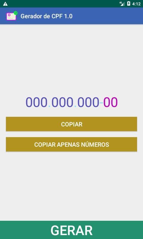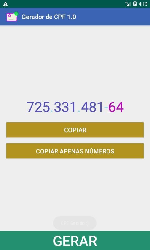 Need multiple valid CPFs to test your system? This APP randomly generates a valid CPF at each click.