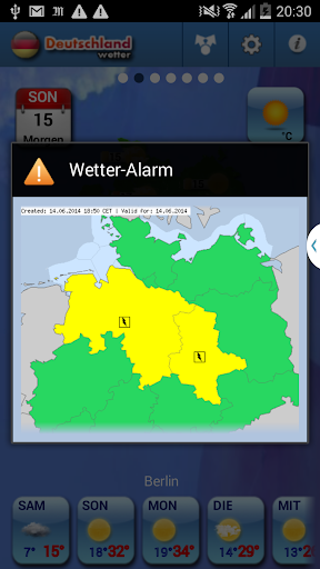 Germany Weather app provides accurate weather forecasts (weather condition, wind, humidity, ephemeris, alerts) for all cities in Germany for seven coming days.