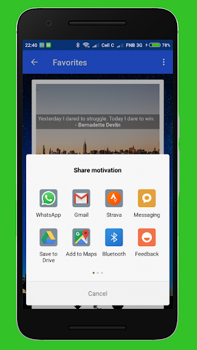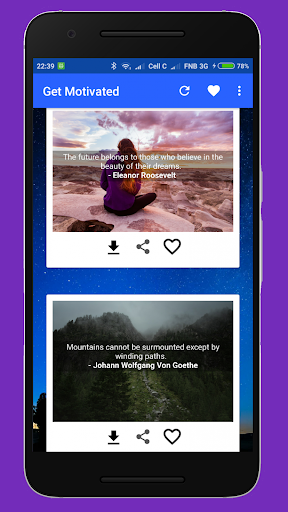Beautiful motivation images can be shared on Social media or saved to your device gallery. You can also build up a gallery of your favorite motivational images within the Get Motivated app.