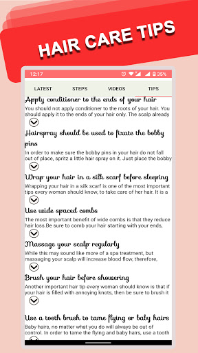 Secondly, this app has pictures of step by step easy hairstyles for girls, step by step hairstyles for teens and step by step free hairstyles for women and all the hairstyles are explained with photos which you can apply any time and anywhere you want.