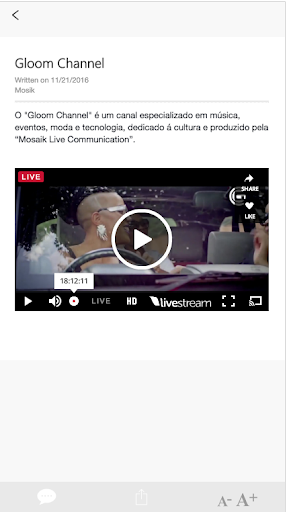 O "Gloom Channel" é um canal especializado em música, eventos, moda e tecnologia, dedicado á cultura e produzido pela “Mosaik Live Communication”.