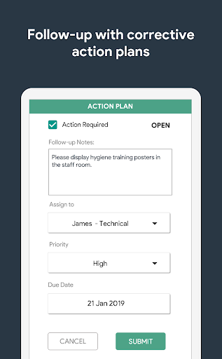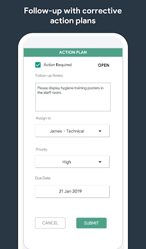 - Unlimited follow-up actions: assign follow-up tasks to individuals for any failures found during audits. Track the status and escalate as required.