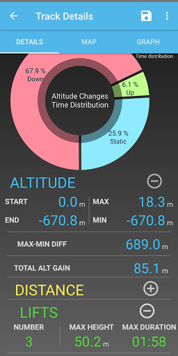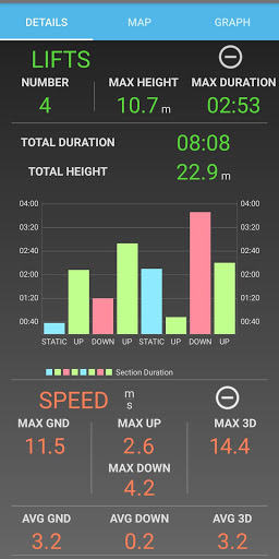 TRACKS - where all your previously recorded Tracks are stored, so you can analyse your results in detail. GoFly gets all the calculations done to present you the data in an accessible way with charts and map. Find out the number and total duration of lifts. Discover your top speeds, ground, vertical and 3D. Check maximum altitude, vertical and 3D-distance travelled.