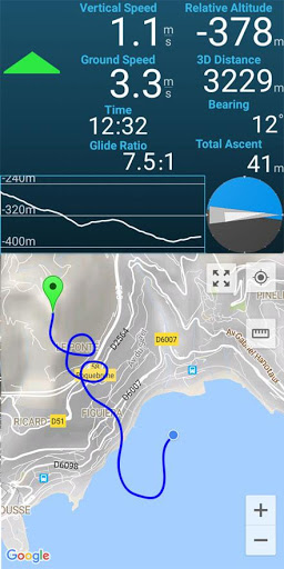 - real-time data: ground and vertical speed, elapsed time, glide ratio, relative altitude, bearing, total ascent, 3D distance travelled,