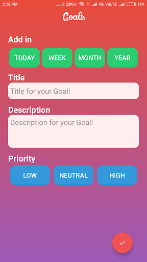 No more worry of the things you keep forgetting .Goals let you store your goals you want to achieve Today, this Week, Month or Year. This today app features all the necessary tools for you to manage your Todo List. Even you can use this app as for saving Notes. :)