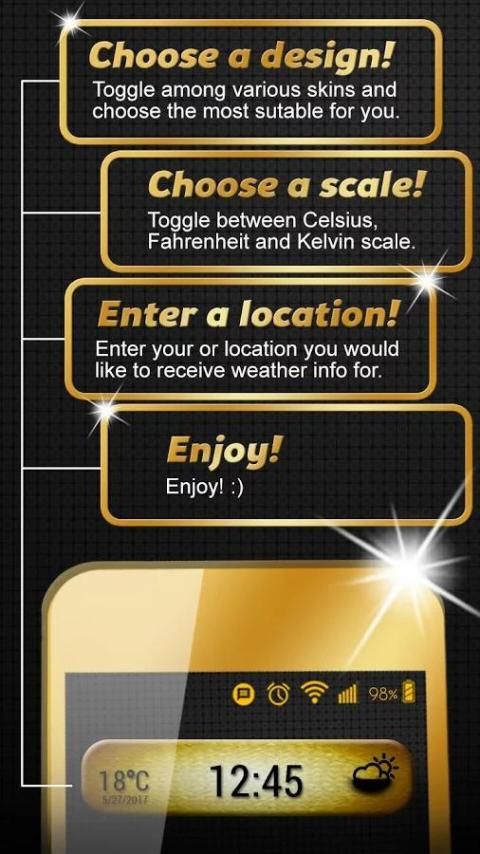 All the digital functions in this time gadget are perfect! This is a luxury app with rich looks! Luxury themes for Android should be your choice! Your mobile phone deserves a little pampering with this “rose gold clock”! Be nice to your smart device and upgrade it with a luxury gold theme deluxe! Indulge yourself always and get this “digital clock 2017” for the full HD experience and style! There's no “golden clock widget” like this one, believe you me! Add some shimmer and shine to your cellphones with “gold widgets”! Choose this digital clock for Android to show how fab you are! Get a lush look for phones with is date and time widget! Enjoy this gold watch face!
