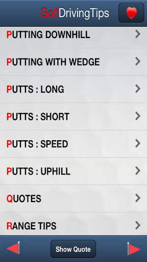 golf,pga tour,pgatour.com,golflogix,masters,viewti,tour tempo,driving,channel,usThe App all Golfers want.Drive it straighter and make more fairways. 10039;s of the latest short golf TIPS amp; secret at your fingertips. Learn from the Pros the secrets of Driving. Download this App to your left amp; for a limited time app includes FREE golf jokes amp; quotes. iPad available. Take it to the range or the course before it39;s too late.Tips are SHORT, concise and to the point Stroke of Geniusquot; 5 STARSquot; T. HarcourtWhat other people may find in poetry or art museums, I find in the flight of a good drive.Arnold PalmerThe most important shot in golf is the next one. Ben HoganGolf is a good walk spoiled. Get our App to find out who said this.You can talk to a fade, but a hook will not listen.Lee TrevinoCarry it with you on the course, or the DRIVING RANGE for quick quot;how toquot; reminders to IMPROVE your Driving making and LOWER your HANDICAP. Learn how to FADE and Draw your Driver.Forget long videos that take forever to load. With this APP find the shot you need to hit, quot;lookquot; it up for a short, concise tips and reminders of long forgotten lessons from the pros. GOLF DRIVING TIPS FREE is your golf instructor on your bag, coaxing you through over 100 shots that the professionals 39;know39; how to hit it longer. Golf39;s a game won or lost between your ears. Sometimes pro golfers get a secret tip from one of their fellow competitors and lowering their putting average. GET these secrets. Learn from the Pros secrets on how to quot;spinquot; the golf ball and lower your average score.GOLF DRIVING TIPS FREE is designed with little known SIMPLE LESSONS. Because it39;s mobile, you can explore and receive golf tips while at work, on the range and during course play. Join us as we explore all types of golf tips.DRIVING TIPS INCLUDE:Driving to Draw Driving Extra YardageDriving to FadeDriving Avoiding a SliceHip TurnLower BodyShoulder TurnTakeawayweight Shiftand hundreds more tips for you to review with GolfTipU full App.Use this app on the course or at the range, organized to make them quick and easy to locate amp; review.In App email for easy forwarding and suggestions for future updates.Email comments to Steven:info@GolfTipU.com