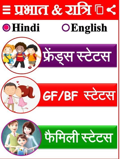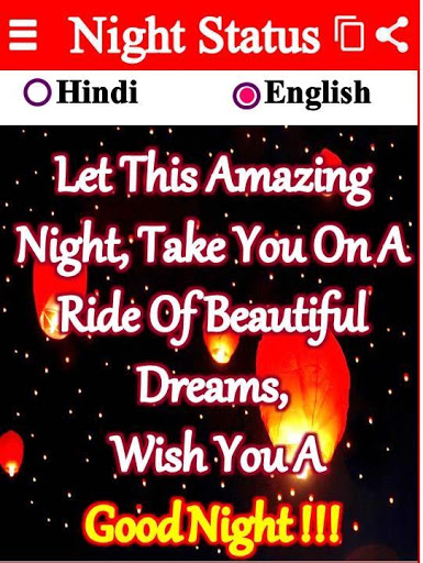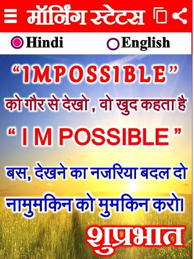 This app provides you a large collection of Good Morning and Good Night Status Shayari. This is an online/offline app that gives you a different Categories of Status Shayari like Good Morning and Good Night Wishes Love Status Inspirational and Positive Thoughts in Hindi and English Languages. You can send these GM and GN Status to your friends and loved ones also.