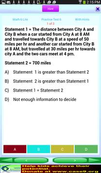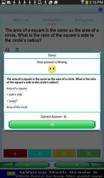 The QVprep Lite Grade 6 app has 9 practice tests for quantitative ability or math. Each practice test comes in two modes - With Hints and Without Hints. If you need help, you can click on the "Hint" button and see hint videos. If you answer a question wrong, the correct answer with detailed explanation is displayed so that you can learn where you went wrong. App displays your score when you complete a practice test.