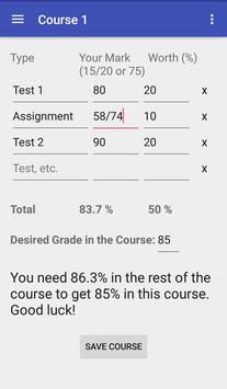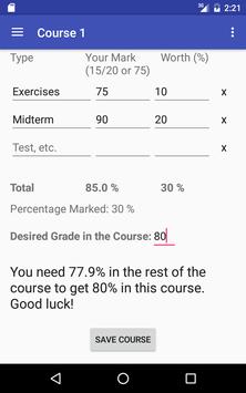 Grade Calculator lets you enter your marks in a course, and tells you what you need to get on the final (or in the rest of the course) to achieve your desired grade.
