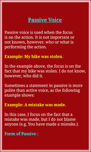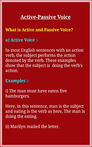 In English grammar, the voice of a verb describes the relationship between the action (or state) that the verb expresses and the participants identified by its arguments (subject, object, etc.). Verbs are either active or passive in voice. In the active voice, the subject and verb relationship is straightforward: the subject is a do-er. In the passive voice, the subject of the sentence is not a do-er. It is shown with by do-er or is not shown in the sentence. Passive voice is used when the action is the focus, not the subject. It is not important (or not known) who does the action. Also know about Adverbs(Comparative-Comparison) and Subject Verb Agreement and many more.