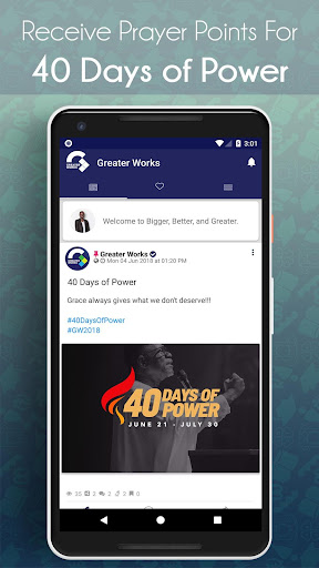 Enrich your Greater Works experience with the Greater Works App. Register for the Greater Works Conference, receive all event information including the prayer points for 40 days of Power, give your donations and enjoy live stream of the power-packed conference right on your phone.