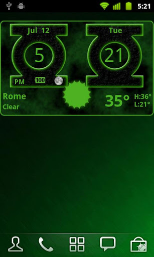 Green Lantern Digital Weather ClockCalendar,Time,System info,weather amp; forecast Green Lantern Digital Weather clock with calendar Time, System info,weather amp; forecastA Digital Clock widget with size 4x2It features:1224 hour clock Color choice on some info displayedSystem Stats Information popup Battery icon on clockWeather amp; Forecast2 Forecast layoutstap bottom rightgt;preferencestap bottom leftgt;System information dialogtap on weather icongt;forecasttap Hourgt;launch anythingset from config screentap Min gt;launch anythingset from config screenWidgets on Android work a bit differently than a normal application. Unlike regular programs they don39;t just install themselves in the application tray so you have to add them manually. They will not open or launch.Here39;s how to add a widget on your Android home screen.STEPS HOW TO ADD A WIDGET1.On your Android home screen, tap any blank or empty area with size 4x2 and hold down your finger.2.An Add to Home screen window will pop up. From that window, tap Widgets.3.Youll be presented with a list of all the installed Widgets on your Android device.4.Select the quot;Green Lantern Digital Weather Clock to add to your home screen by tapping it.Notesquot;Time frozennot updatingquot;gt; taskiller killed the clockexclude it from taskillersWhen phone starts, clock starts in less than a min too.ROM usersgt; make sure the clock is NOT moved on SD card.Widgets are not supposed to be on SD card. Move it back to the phone storage.Weather hint: For world destinations with two words in the name, type in the box the words with a plus sign.For example quot;Buenos Airesquot; type quot;BuenosAiresquot;,remember the quot;quot; sign no spaces, don39;t include the quotes.Email problemssuggestionsCheck our website for more help.EXCLUDE IT FROM TASKILLERSBe polite, this is a free app :VIDEO HOW TO ADD WIDGETShttp:www.youtube.comwatch?vDpMLF9b2aTQ