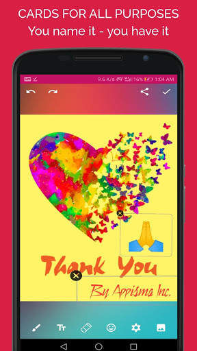 This greetings cards making app has cards for New Year's Day, Epiphany, St. Patrick's Day, Good Friday, Easter, Mother's Day, Armed Forces Day, Eid ul fitr, Father's Day, Fourth of July, Grandparents day, Rosh Hashanah, National Boss Day, Sweetest Day, Halloween, Veterans Day, Thanksgiving, Hanukkah, Christmas, Passover, Nurses Day, Holiday cards & all season's greetings.