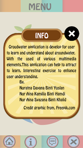 Groundwater applications is the way students can learn and understand about groundwater. Thus we would like to develop an application to help increase their knowledge and for a better understanding of groundwater. The user can understand kind of water resources and the formula of the calculation of the flow water. Due to most of the people have smart phone now, so we decided to develop this application.