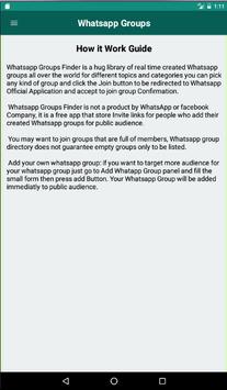 Groups Finder for Whatsapp helps you to find the right whatsapp group that fits your needs by browsing hundreds of groups created every day witha large unlimited feed.