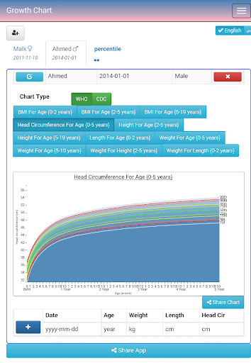 4- Percentile/Z-Score, By entering Date-of-Birth, Date ,Gender, Weight, Length/Height, Head-Circumference, you can view the percentiles.