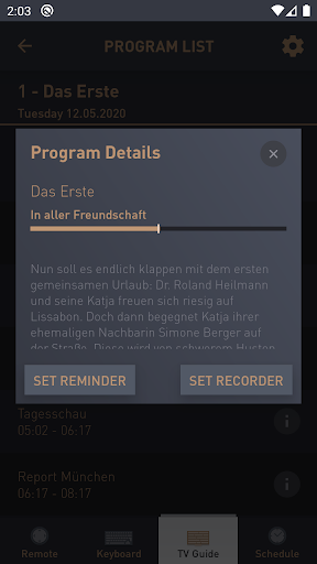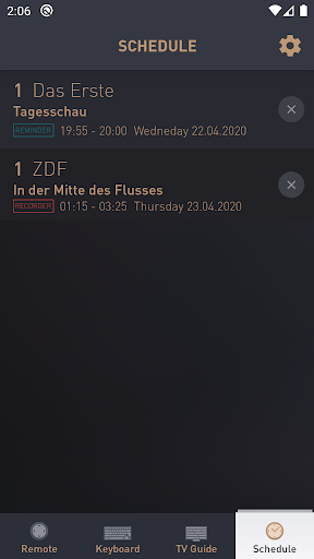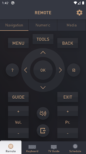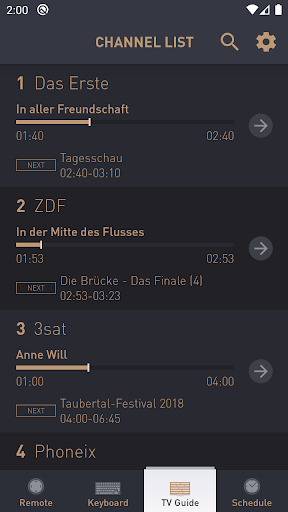 The application offers different screen functions: Remote, Keyboard, Smart Guide and Schedule list.