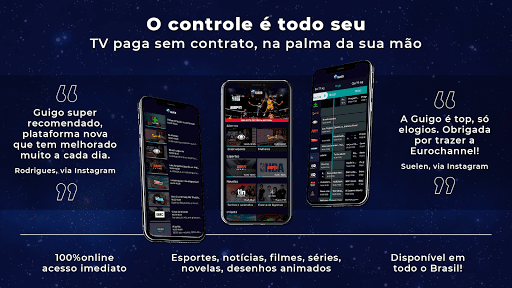A Guigo TV é a primeira televisão por assinatura via internet do Brasil e 100% legalizada. Você pode assistir aos seus canais favoritos pelo app, no celular, tablet ou smart TV, ou pelo computador, acessando nosso site.