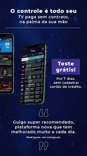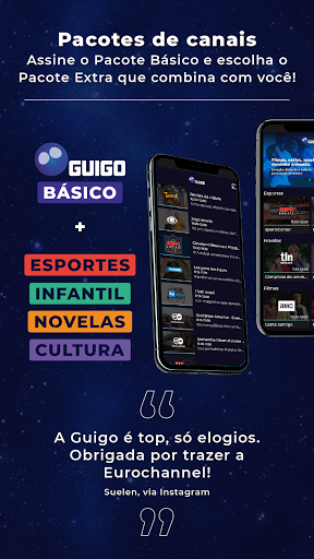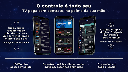 A Guigo TV é a melhor alternativa para quem está cansado da TV a cabo. Além de poder ver seus canais em dispositivos diferentes, você também pode assistir de qualquer lugar do Brasil com sinal de internet - chega de ficar preso à TV da sua casa. Bem-vindo ao futuro da TV por assinatura!