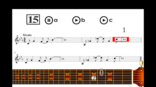 On each lesson you will see a sheet music and you will listen what is written on it. You will see animations of the beats, the notes on the staff and the numbers of the fingers of the left hand on the guitar fretboard. This allows you to relate what is written on a score with that which is played on the GUITAR.
