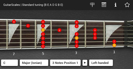 is a free android application for learning guitar scales for 7 strings guitar and memorize the notes on the guitar fretboard. It contains chromatic, Ionian (major), harmonic major, Dorian, Phrygian, Lydian, Mixolydian, Aeolian (minor), Locrian, harmonic minor, major pentatonic, minor pentatonic, blues pentatonic, Hungarian Gypsy, Ukrainian Dorian, Acoustic, Persian, Algerian, Flamenco, Hawaiian, Chinese, Byzantine and Neopolitan scales.