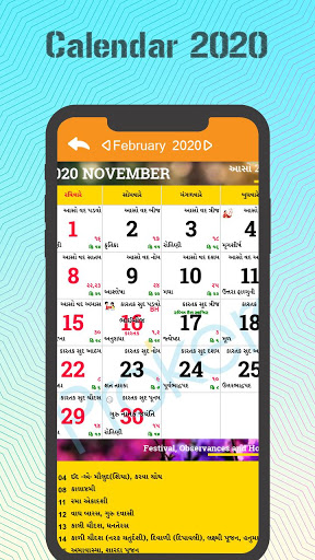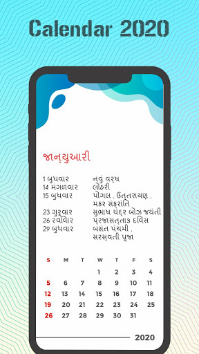 This app has high quality monthly images that allows you to view maasa, vaara, thithi, nakshatra and all holidays information for all days in the year 2020 in Gujarati.