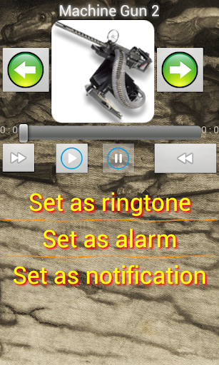 If you are an admirer of weapons such as glock, shotgun, ak47, barreta, colt, machine gun, hekler or uzi, download this incredible app for your super Samsung Galaxy S, Sony Xperia S, HTC, Huawei, Motorola, LG, Alcatel, Spice, and enjoy these sounds on your android mobile phone every day and set it either as ringtone, sms, contact or alarm.