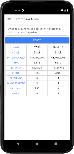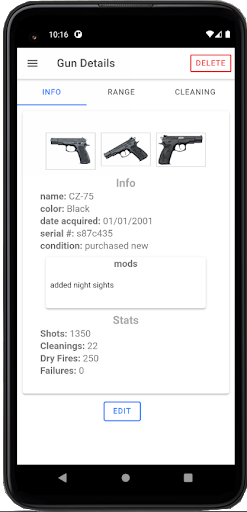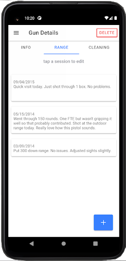 Gun Tracker gives you the ability to keep detailed records for your guns. You can track things like the number of rounds fired, cleanings, etc as well as keep notes on individual range sessions. Range and cleaning sessions are automatically organized according to the date they were entered but can be manually edited at a later time.