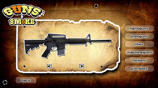 guns amp; Smoke is a casual application to inform Guns Lovers about Genre of GunsWhen the GUN strikes it generates SMOKE. GUNS n SMOKE tells different genre of Guns and its sounds and make.The best Guns app that supports Modern Warfare Guns supported to all resolutions of devices.Best and Hit Guns and weapons like Riffle , Shot Guns, Hand Guns, Machine Guns, Bombs, Assault Riffles,Snipers for FreeSuper hitbullet Action for freeTap the screen to shake, vibrate and fire the Guns amp; weapons for free in this addictive appBuy Pro version to shoot birds Cow Boy amp; weapons themeFeatures:You Can select any model of Gernades, Rocket launchers with actual voices.Get details of the different Guns and its background and History.Tap the targets to shoot. RICH GRAPhics of insanely powerful Armor and other explosive powerups to get your hands on with real simulation.Comments amp; ReviewsIt39;s coolby jennifer May 29, 2011Amazing graphics, one of the most intense shooters everby crystal April 22, 2011This is awsomeby jak May 14, 2011Disclaimer: This free app is ad supported and may contain ads in the notification tray andor home screen. The required permissions are just for ads.Download PRO version completely Free of Ads.