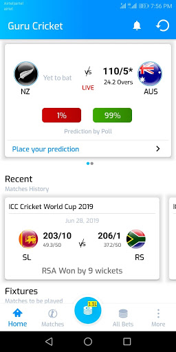 Guru Cricket mobile application has been designed keeping in mind the avid lovers of the game, just like you! Increase the excitement of the cricket match by participating in live betting. This app lets users place real time bets and predict the odds in an ongoing cricket match. As the live match progresses, the session rate changes depending upon the match situation. The user needs to predict and place his bet accordingly. For every correct prediction, user earns coins which can be redeemed to get attractive prizes.